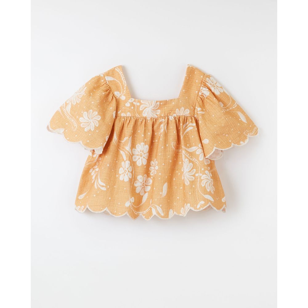 Bata infantil desenvolvida em tecido 100% algodão, com decote reto e quadrado, acabamento ondulado com bordado nas mangas curtas e na barra, abotoamento nas costas, e os desenhos da estampa Zelita.