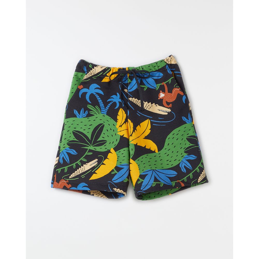 Bermuda de Moletom para crianças, com bolsos, amarração regulável no cós e os desenhos coloridos da estampa Selva.
