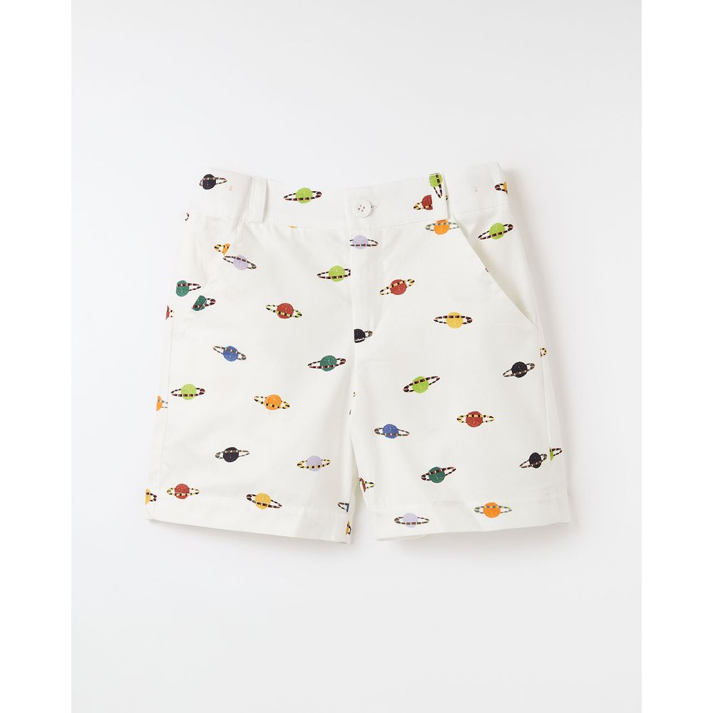 Bermuda infantil desenvolvida em tecido 100% algodão, com passadores, fechamento por abotoamento e zíper na cintura, bolsos laterais e nas costas, e os desenhos de plaentas coloridos da estampa Planetito.