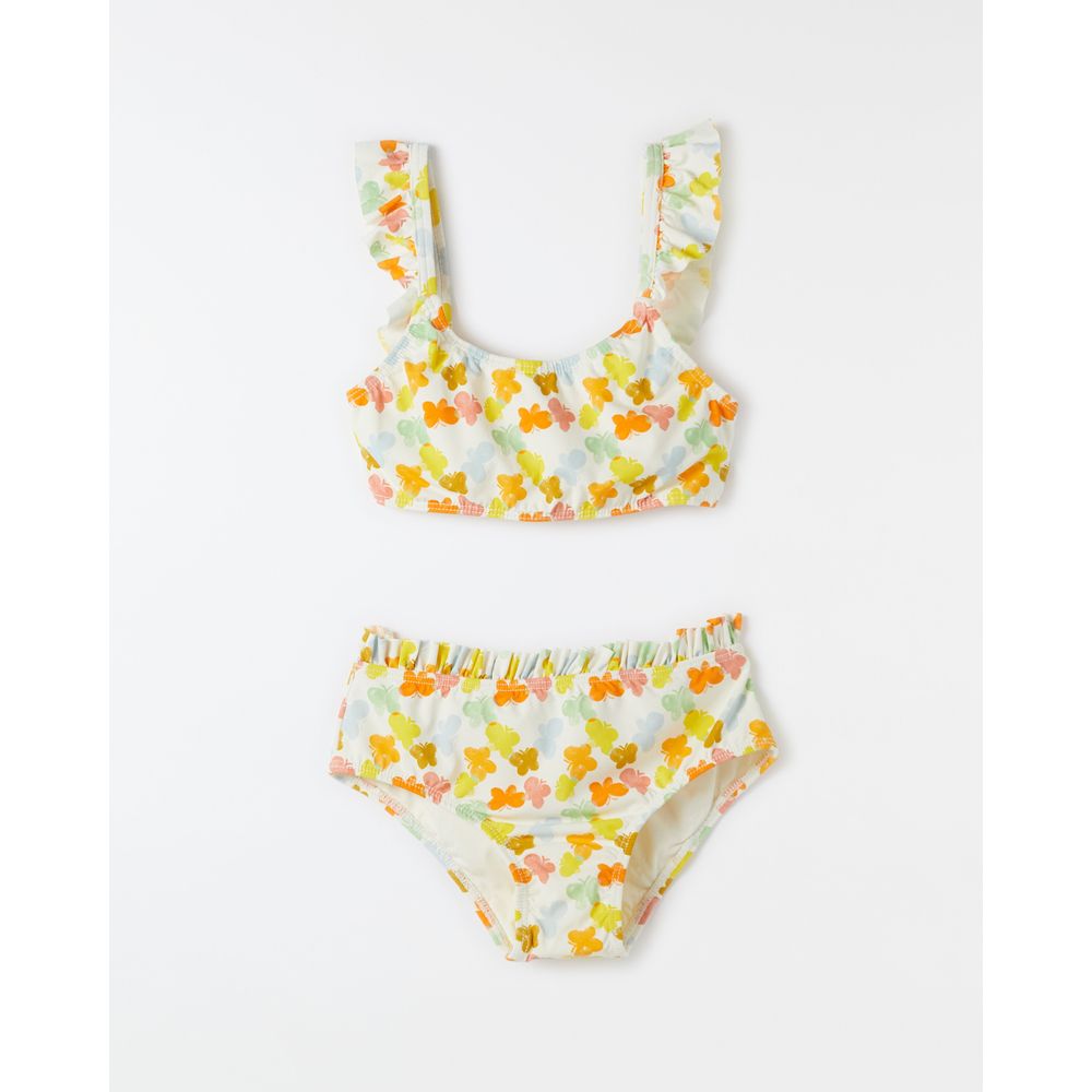 Biquíni infantil na estampa Borbojuba com forro, mistura de elastano para priorizar o conforto, top com decote em U, amarração regulável nas costas e babado nas alças e na cintura da calcinha.
