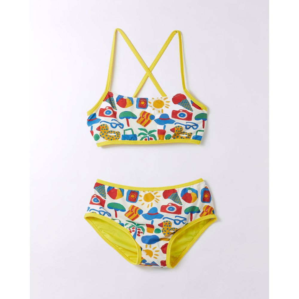 Biquíni infantil na estampa Dia de Sol, com forro, mistura de elastano para priorizar o conforto, top com decote reto, vivo em cor vibrante nos acabamentos, e alças reguláveis por amarração nas costas.