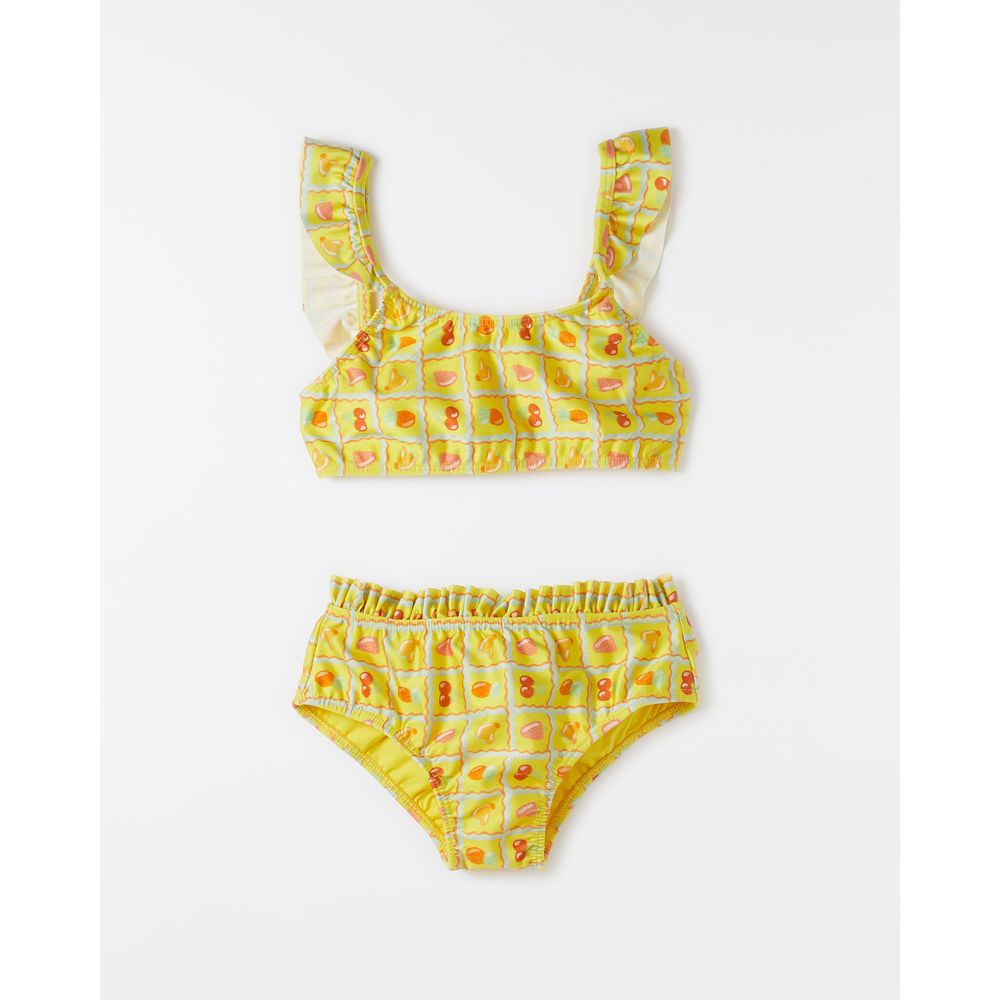 Biquíni infantil na estampa Gominha com forro, mistura de elastano para priorizar o conforto, top com decote em U, amarração regulável nas costas e babado nas alças e na cintura da calcinha.