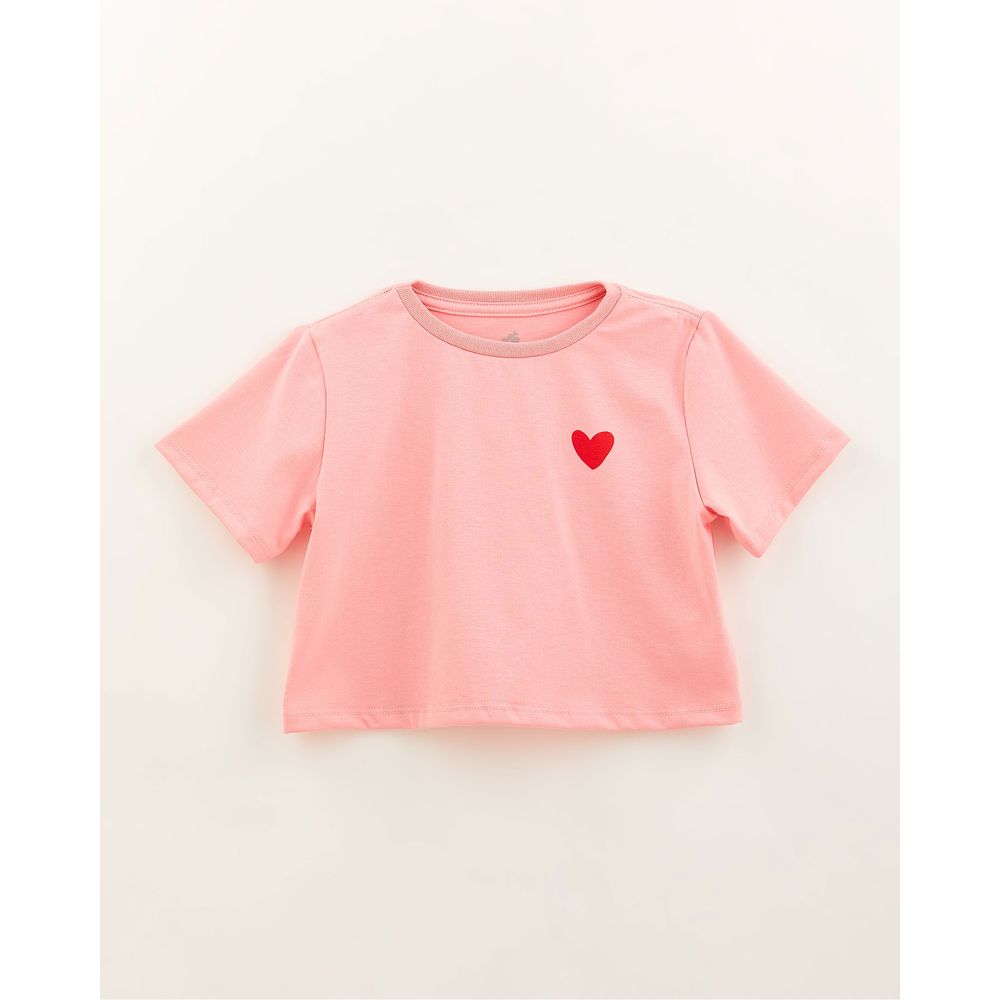 Blusa básica para crianças, com mangas curtas, decote redondo, e silk de coração na parte frontal.