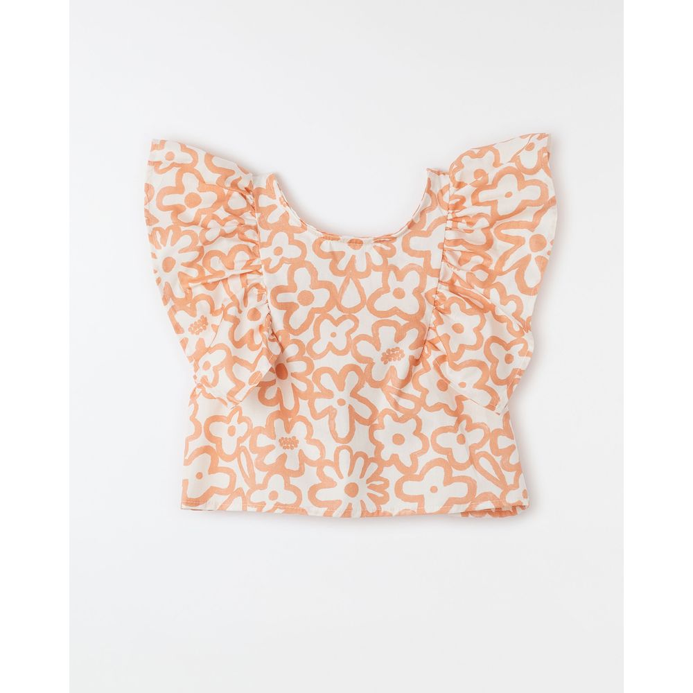 Blusa infantil desenvolvida em tecido 100% algodão, com decote em U, babado nas alças, recorte nas costas e os desenhos de flores da estampa Blu Bicolor.