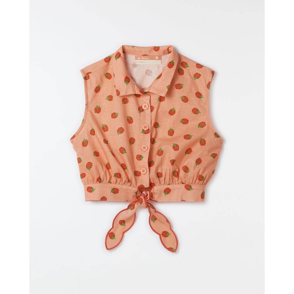 Blusa infantil desenvolvida em tecido 100% algodão com gola colarinho, alças largas, barra regulável por amarração com bordado colorido nos acabamentos, abotoamento frontal e os desenhos de morangos da estampa Brotinho.