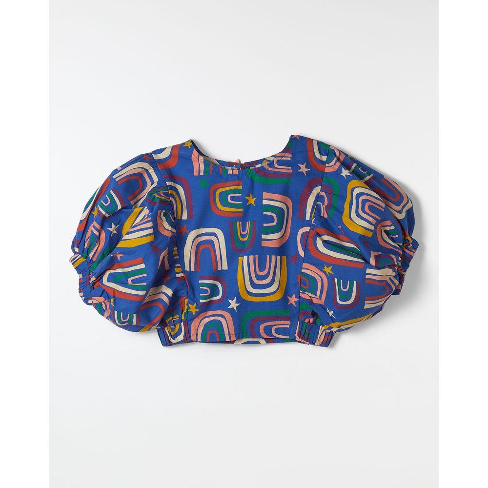 Blusa infantil desenvolvida em tecido 100% algodão, com mangas bufantes, comprimento cropped, decote redondo, acabamentos de elástico na barra, recorte nas costas com fechamento por abotoamento, e os desenhos coloridos da estampa Cosmoiris.