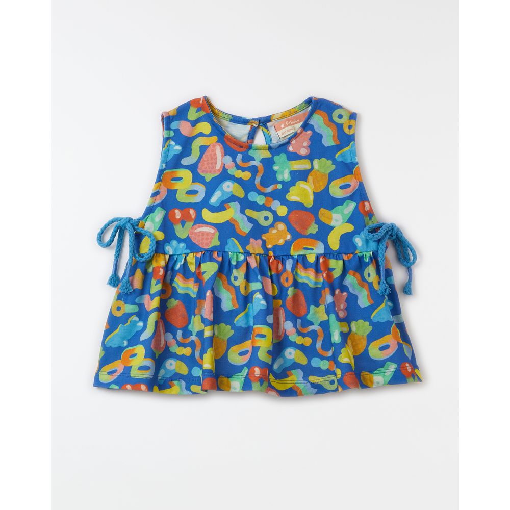 Blusa infantil desenvolvida em malha de algodão com alças, decote em U, recorte com abotoamento nas costas, babado na barra, cadarço regulável por amarração nas laterais da cintura e os desenhos coloridos da estampa Docinha.