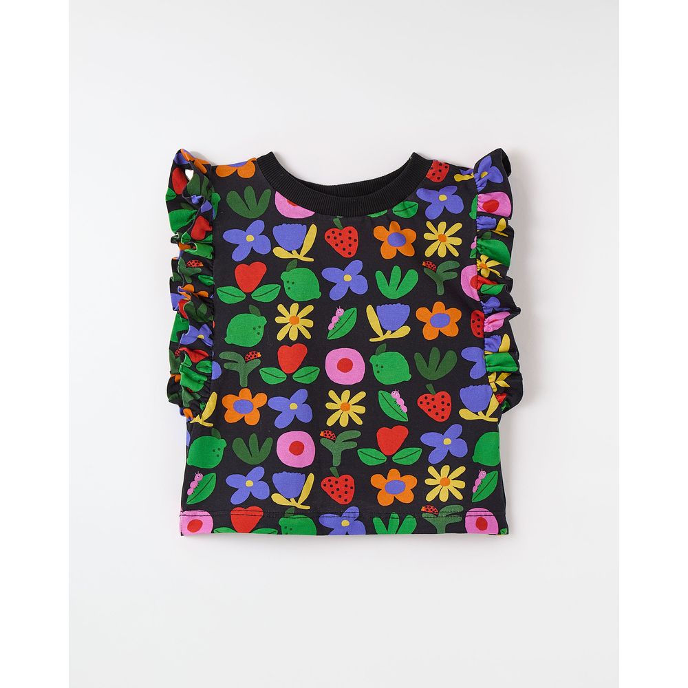 Blusa infantil desenvolvida em malha de algodão com babado nas alças, vivo canelado no decote redondo e os desenhos de flores coloridas da estampa Jardinzin.