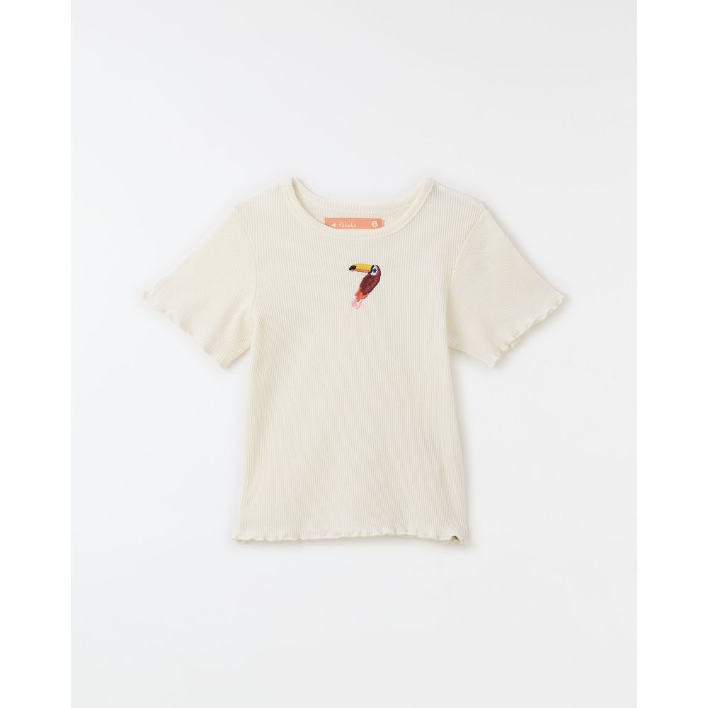 Blusa Rib para crianças com vivo canelado no decote em U, bordado de tucano na parte frontal, acabamentos ondulados na barra e nas mangas curtas.
