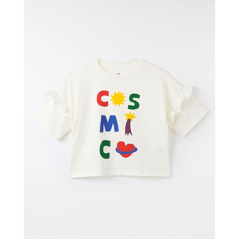 Blusa infantil desenvolvida em tecido 100% algodão, com babado nas mangas curtas, vivo canelado no decote redondo, e os desenhos coloridos do silk Cósmico na parte frontal.