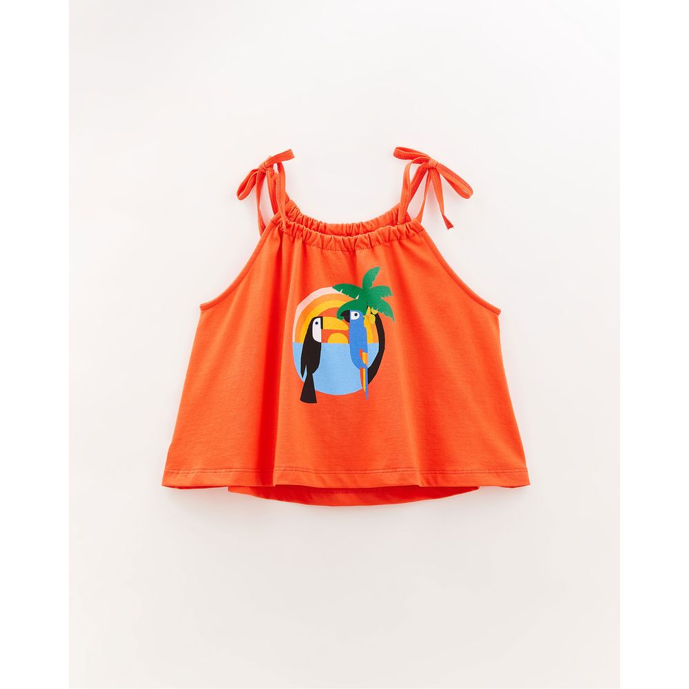 Blusa infantil com alças duplas em rolotê no decote regulável por amarração, modelagem soltinha, e silk Maré na parte frontal.