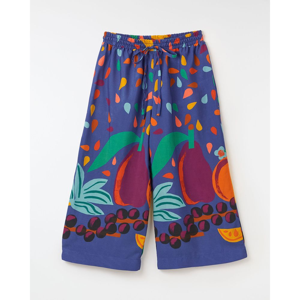 Calça infantil com elástico no cós regulável por amarração, mini fendas na barra das pernas amplas, e os desenhos de frutinhas coloridas da estampa Frutifica.