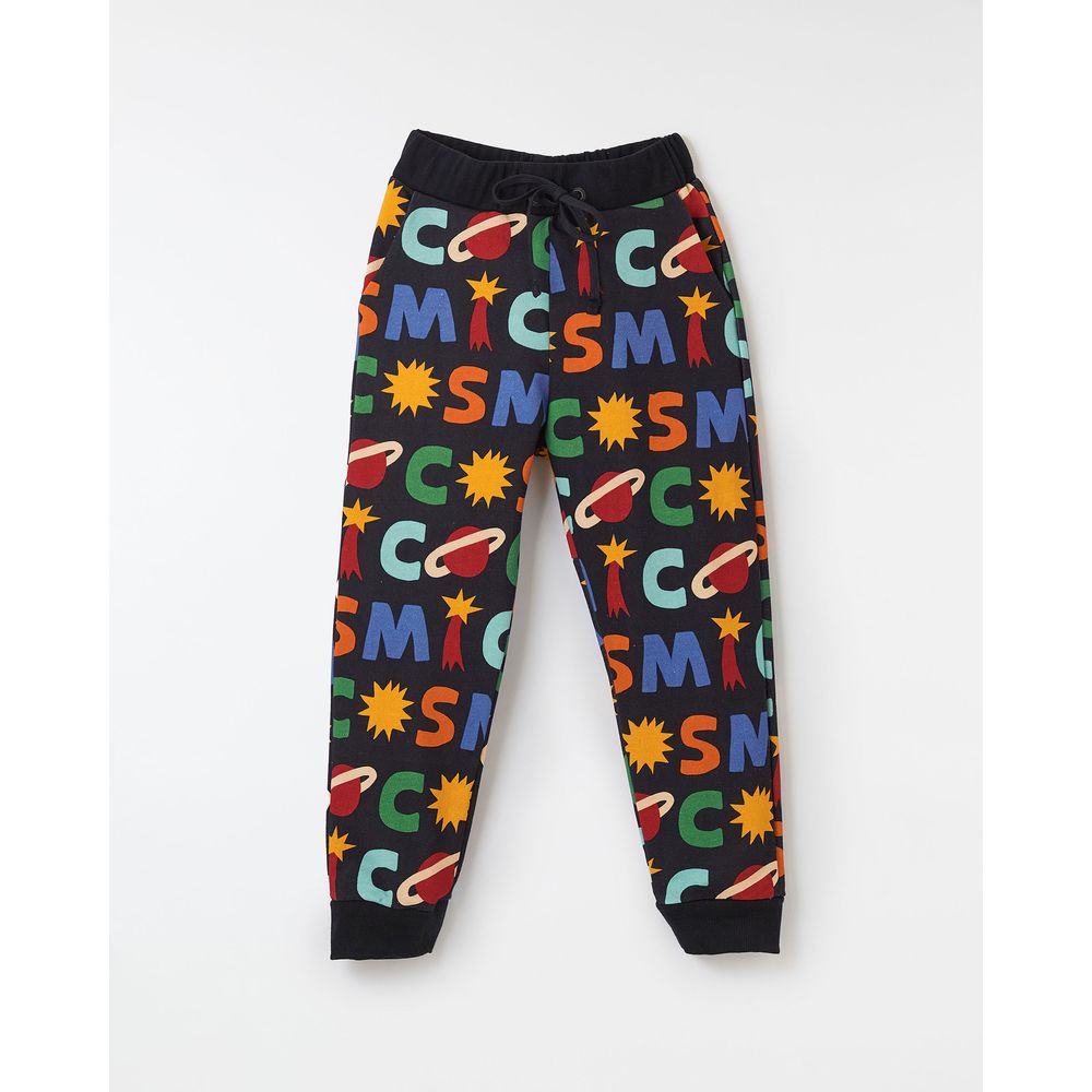 Calça de Moletom para crianças, com amarração regulável no cós, bolsos, vivo canelado nos tornozelos, e os desenhos coloridos da estampa Cósmico.