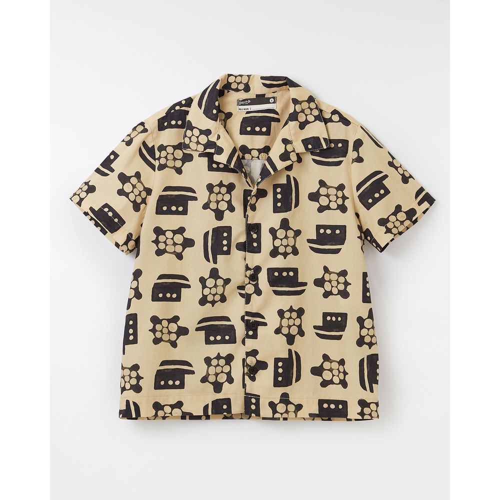 Camisa infantil com mangas curtas, gola colarinho, abotoamento frontal, pala nas costas, e os desenhos da estampa Navegante.