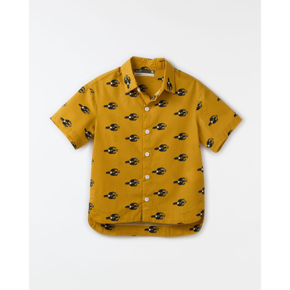 Camisa infantil com mangas curtas, gola colarinho, abotoamento frontal, pala nas costas, barra fraldada, e os desenhos da estampa Tucanildo.