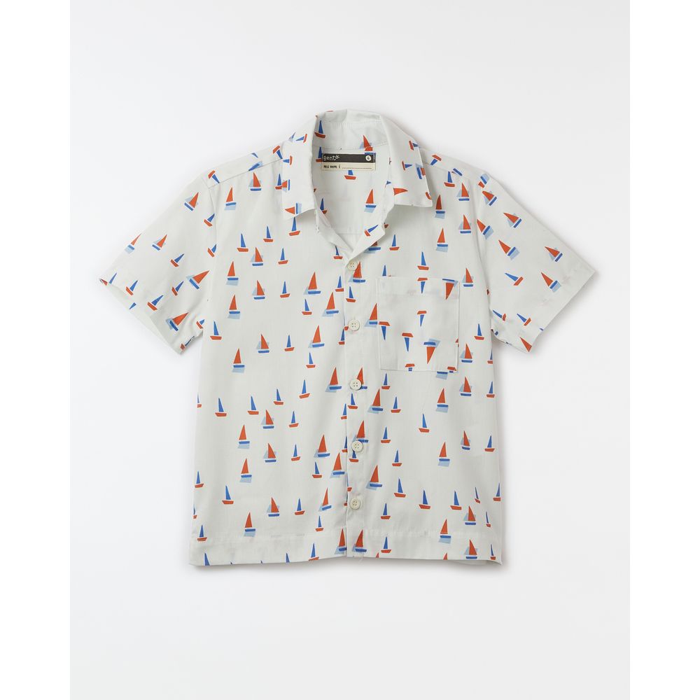 Camisa infantil desenvolvida em tecido 100% algodão com mangas curtas, gola colarinho, abotoamento frontal, pala nas costas, bolso frontal e os desenhos de barquinhos da estampa Velejar.