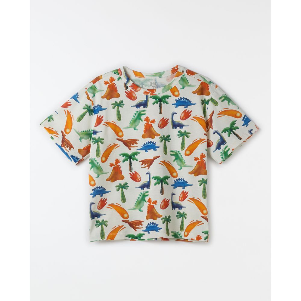 Camiseta infantil desenvolvida em tecido 100% algodão com mangas curtas, vivo no decote redondo e os desenhos coloridos da estampa Jujussauro.