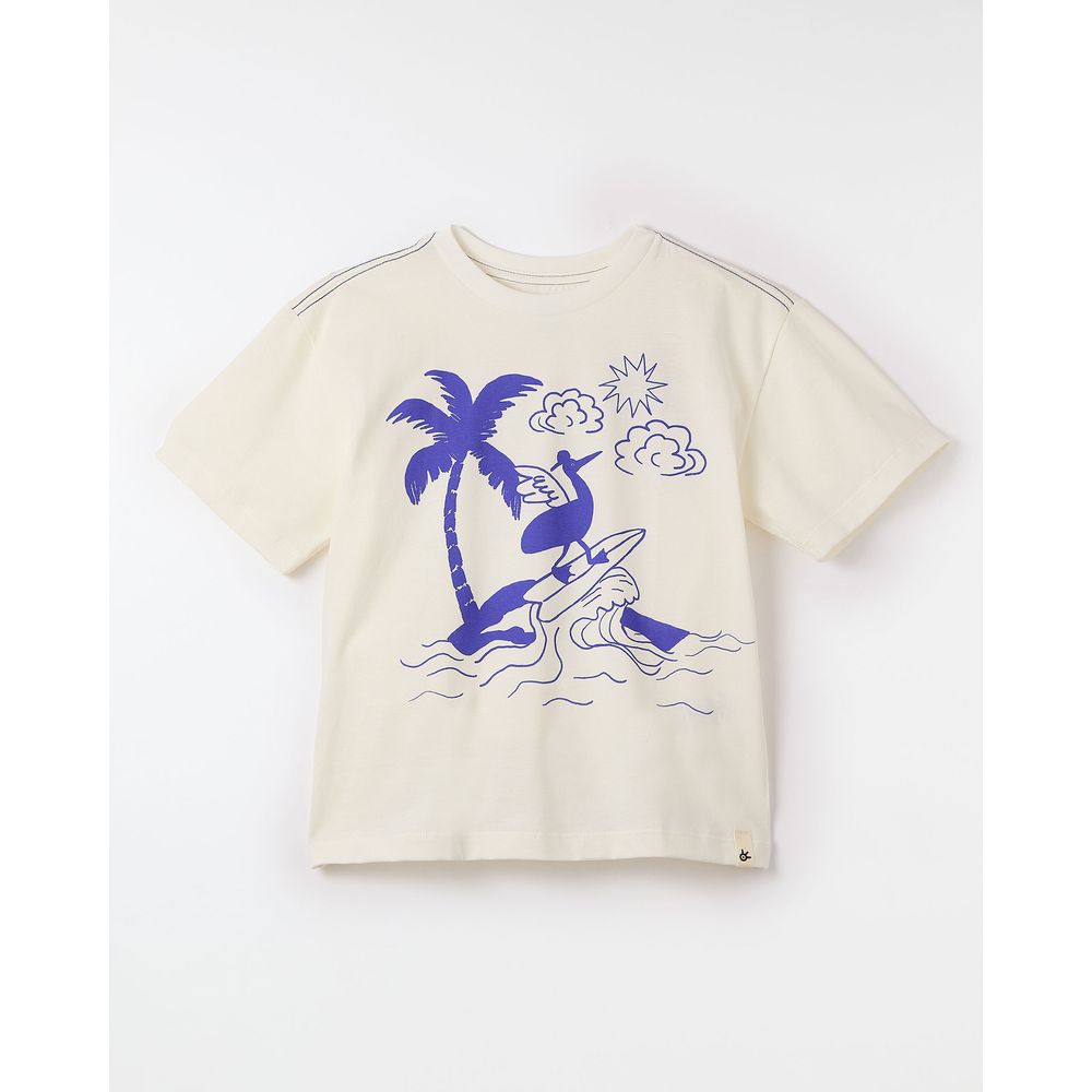 Camiseta infantil desenvolvida em tecido 100% algodão com mangas curtas, vivo canelado no decote redondo, costuras em tom vibrante e os desenhos do silk Pegando Onda na parte frontal.
