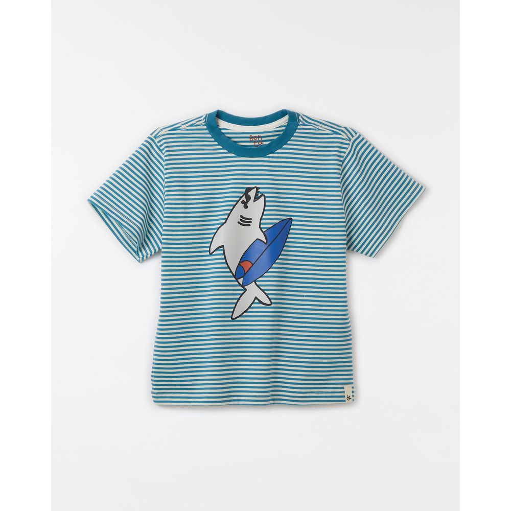 Camiseta infantil listrada desenvolvida em tecido 100% algodão com mangas curtas, vivo colorido no decote redondo e silk Tubarão Surfista na parte frontal.