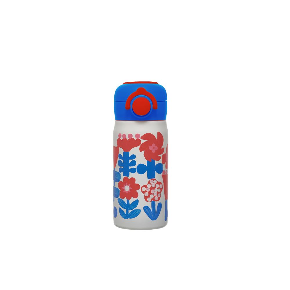 Garrafa térmica de aço inoxidável estampada de 330ml, tampa com alça rígida e canudo de silicone e capacidade de 330ml.