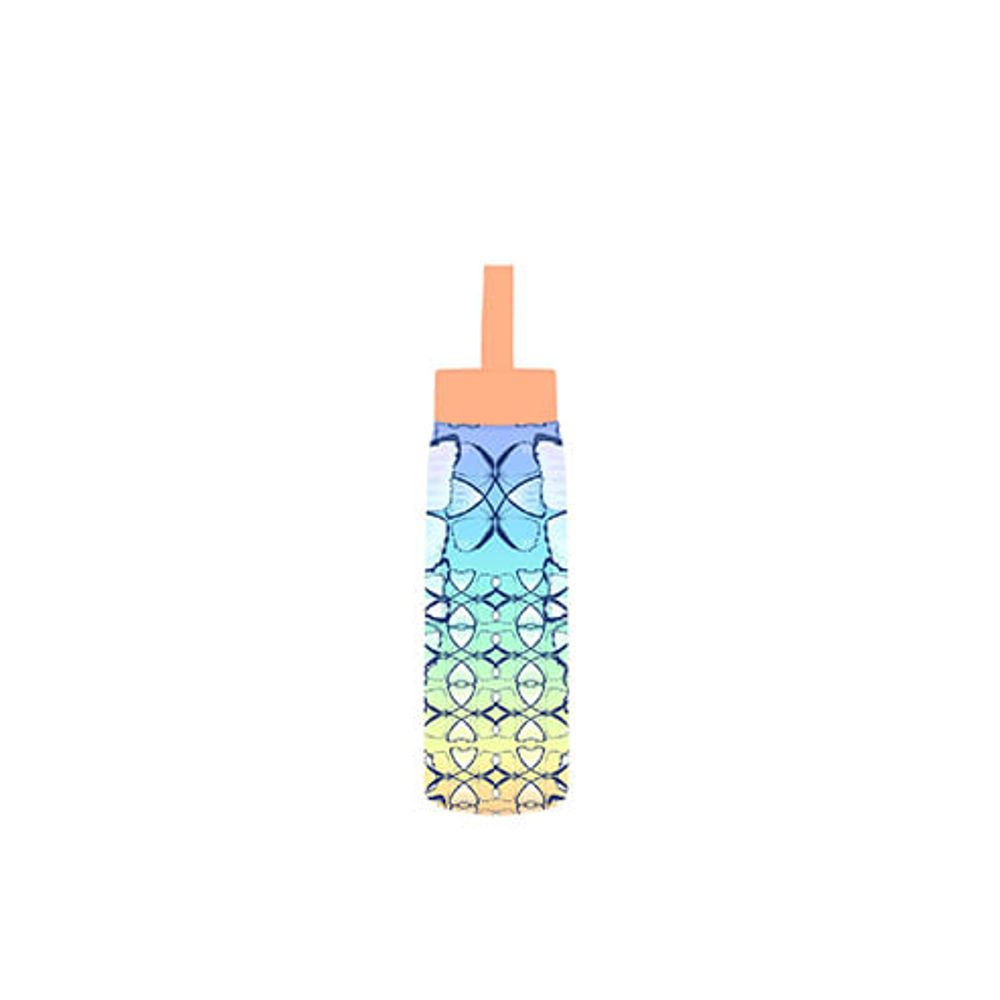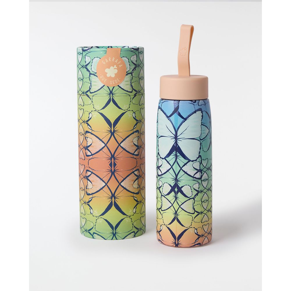 Garrafa térmica de aço inoxidável estampada, tampa com fecho hermético e capacidade de 500ml.