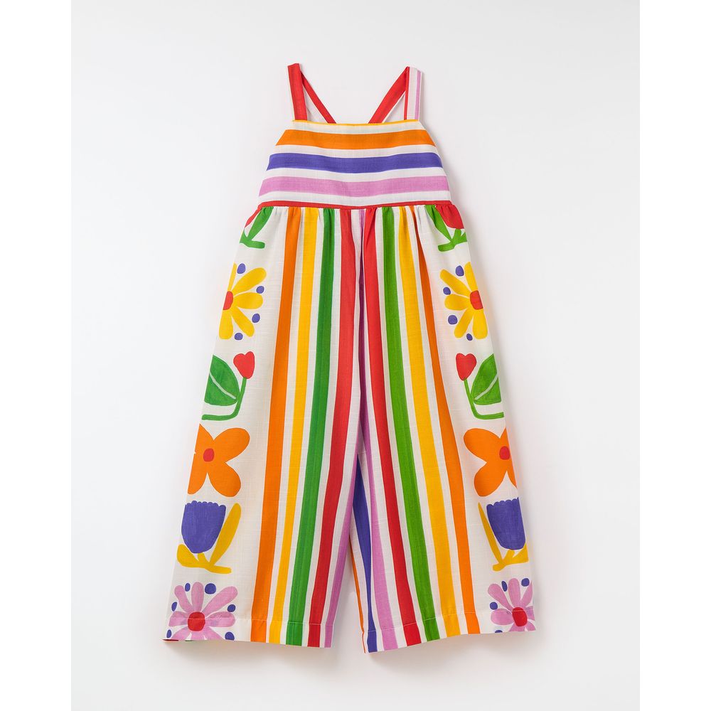 Macacão infantil desenvolvido em tecido 100% algodão com decote reto, alças reguláveis por amarração nas costas e os desenhos de listras e flores da estampa Multicor.