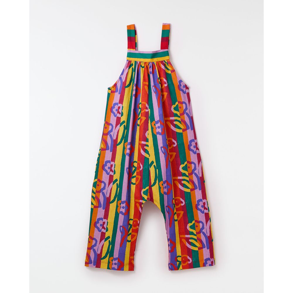 Macacão infantil desenvolvido em malha de algodão com alças reguláveis por amarração, decote reto e as listras coloridas da estampa Flor de Rayas.