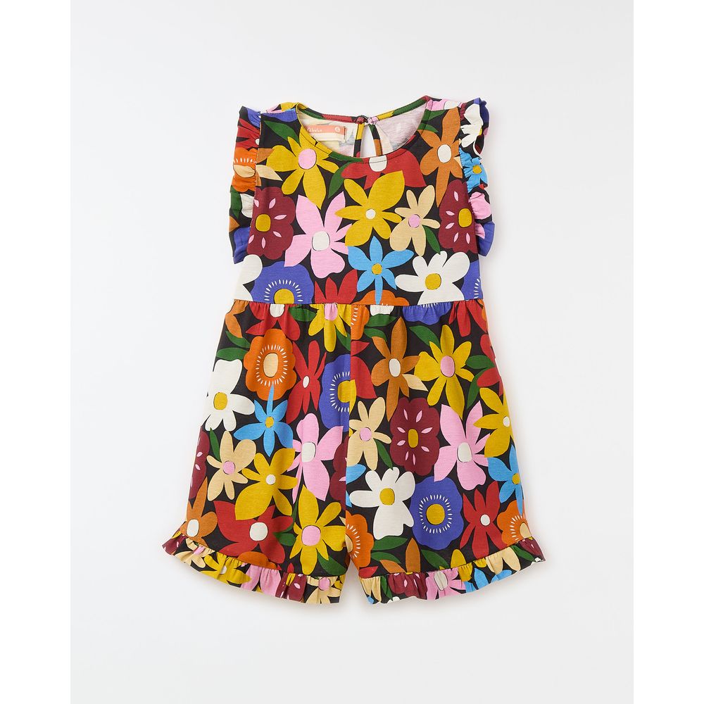 Macaquinho infantil desenvolvido em malha de algodão, com decote em u, babado nas alças e nas pernas, recorte na cintura, abertura com fechamento por abotoamento nas costas e os desenhos coloridos da estampa Floria.