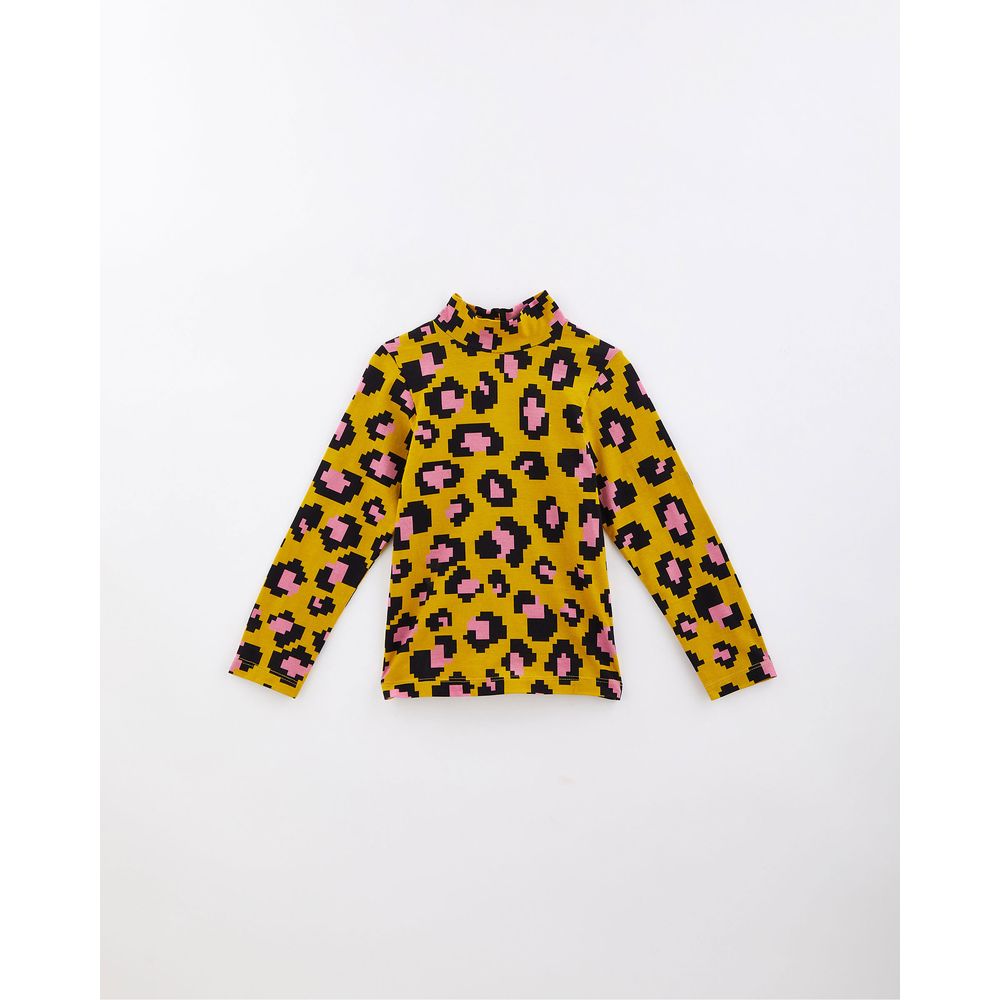 Blusa off white desenvolvida em malha rib para crianças, com mangas longas, gola alta, e os desenhos da estampa Onça Pixel.