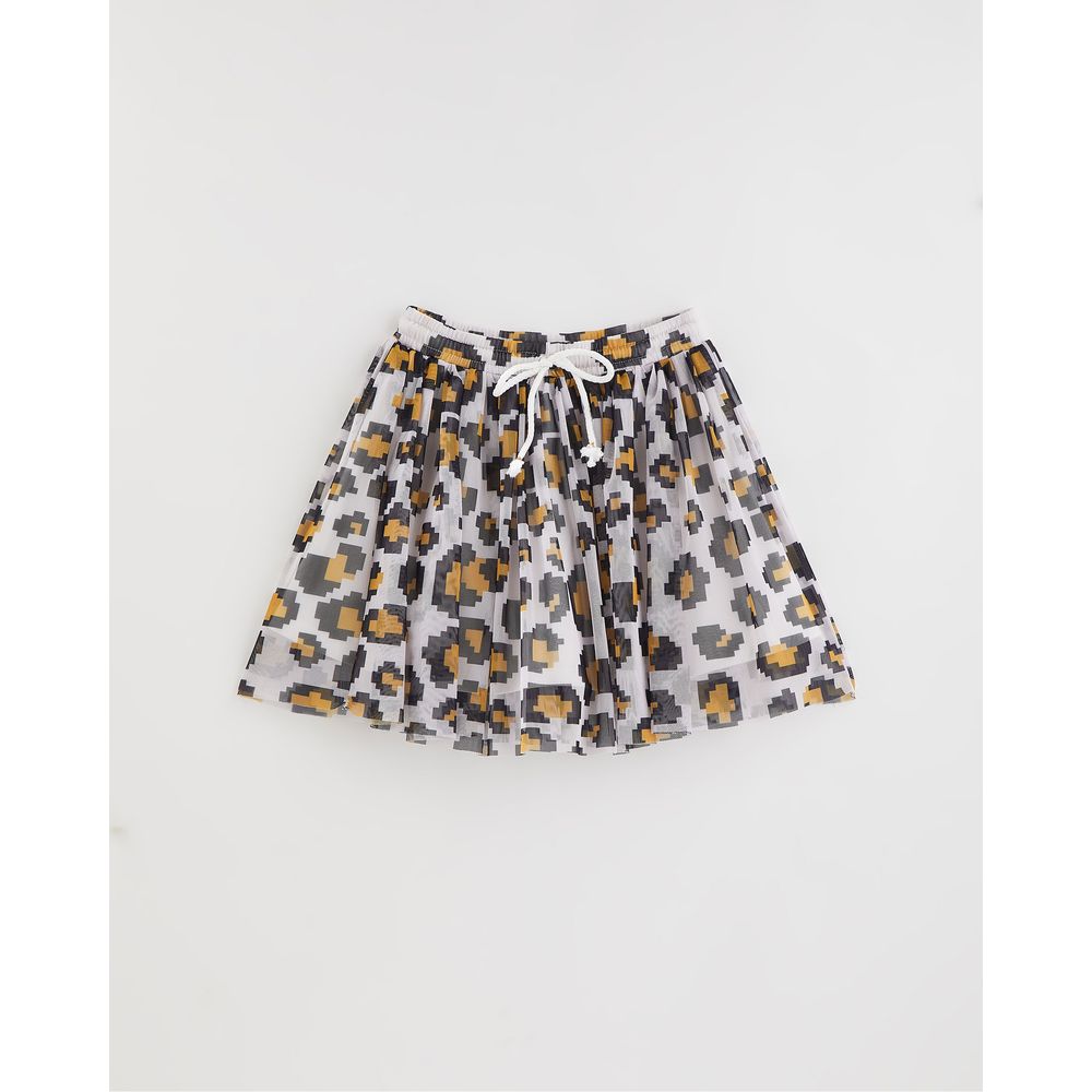 Saia infantil desenvolvida em tule off white estampado de onça com forro e cós de elástico regulável por amarração.