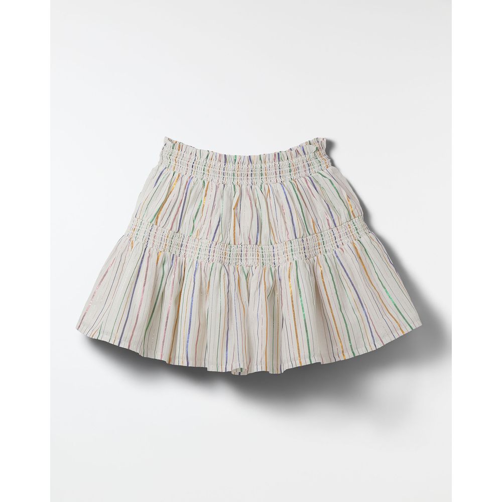 Saia com listras coloridas metalizadas e cintura de lastex. A roupa, parte da linha FARM Futura, destaca-se pelo design único com caimento godê e elástico no quadril. Ideal para compor visuais casuais com um toque original. Perfeita para aquele passeio descontraído. Combine com tops variados.