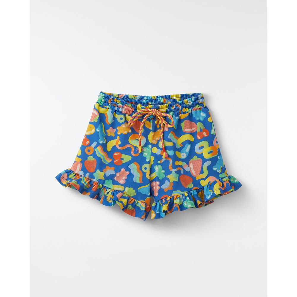 Short infantil desenvolvido em malha de algodão com elástico regulável por amarração na cintura, babado na barra e os desenhos coloridos da estampa Docinha.