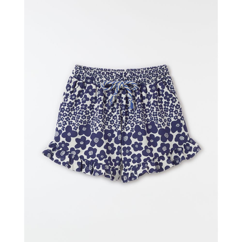Short infantil desenvolvido em malha de algodão com bolsos, babado na barra, elástico na cintura com amarração regulável e os desenhos da estampa Flor Bela.