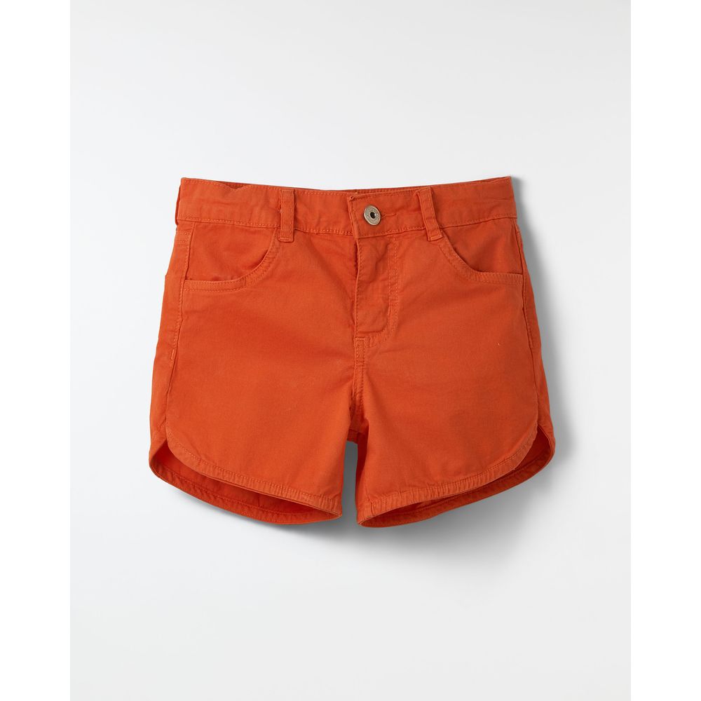 Short infantil desenvolvido em sarja colorida, com abotoamento + passadores no cós, bolsos e barra fraldada.