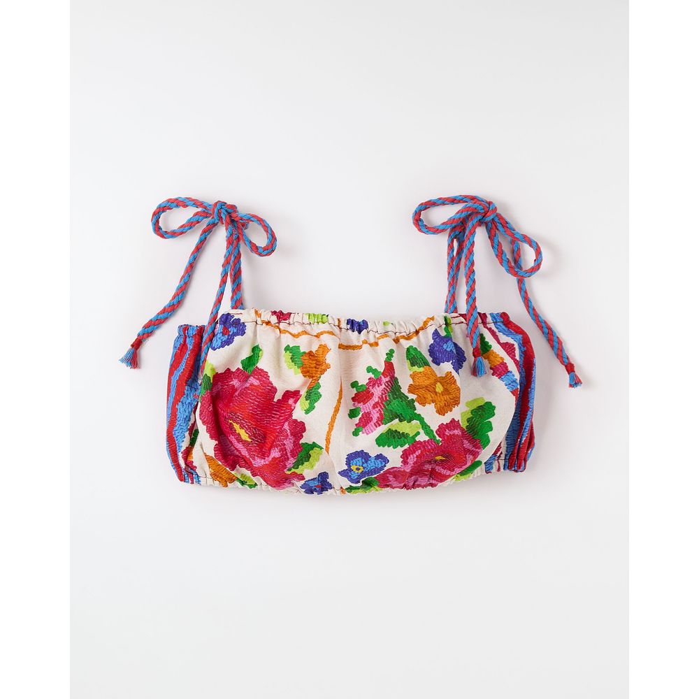 Top infantil desenvolvido em tecido 100% algodão com acabamentos de elástico, decote reto, alças duplas de cadarço colorido reguláveis por amarração e os desenhos da estampa Floreria.