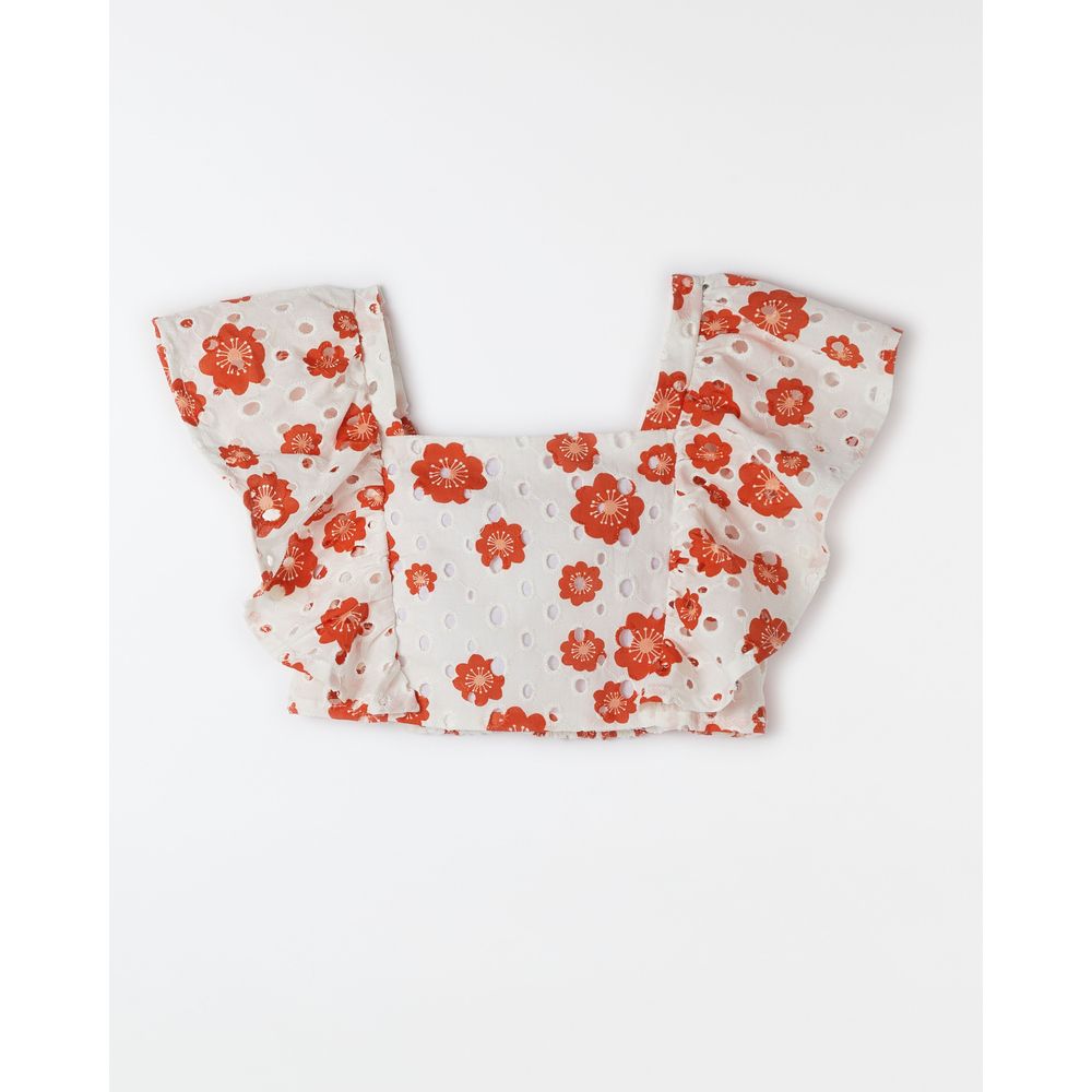 Top infantil desenvolvido em laise de algodão com forro, decote reto, lastex nas costas, babado nas alças e os desenhos de flores da estampa Florinha.