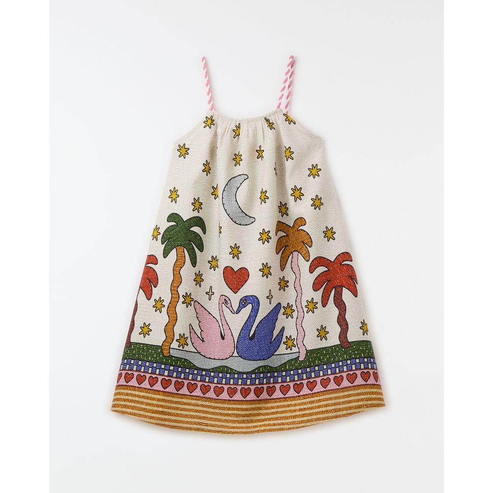 Vestido infantil estampado com barrado, decote em u, modelagem soltinha e cadarço bicolor nas alças.