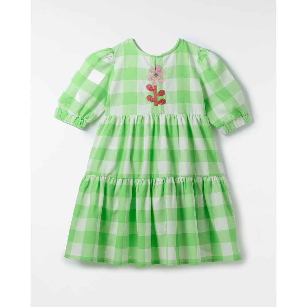 Vestido infantil desenvolvido em tecido 100% algodão, com estampa xadrez, mangas curtas bufantes, saia rodada com recorte, decote redondo, recorte com abotoamento nas costas, e bordado frontal.