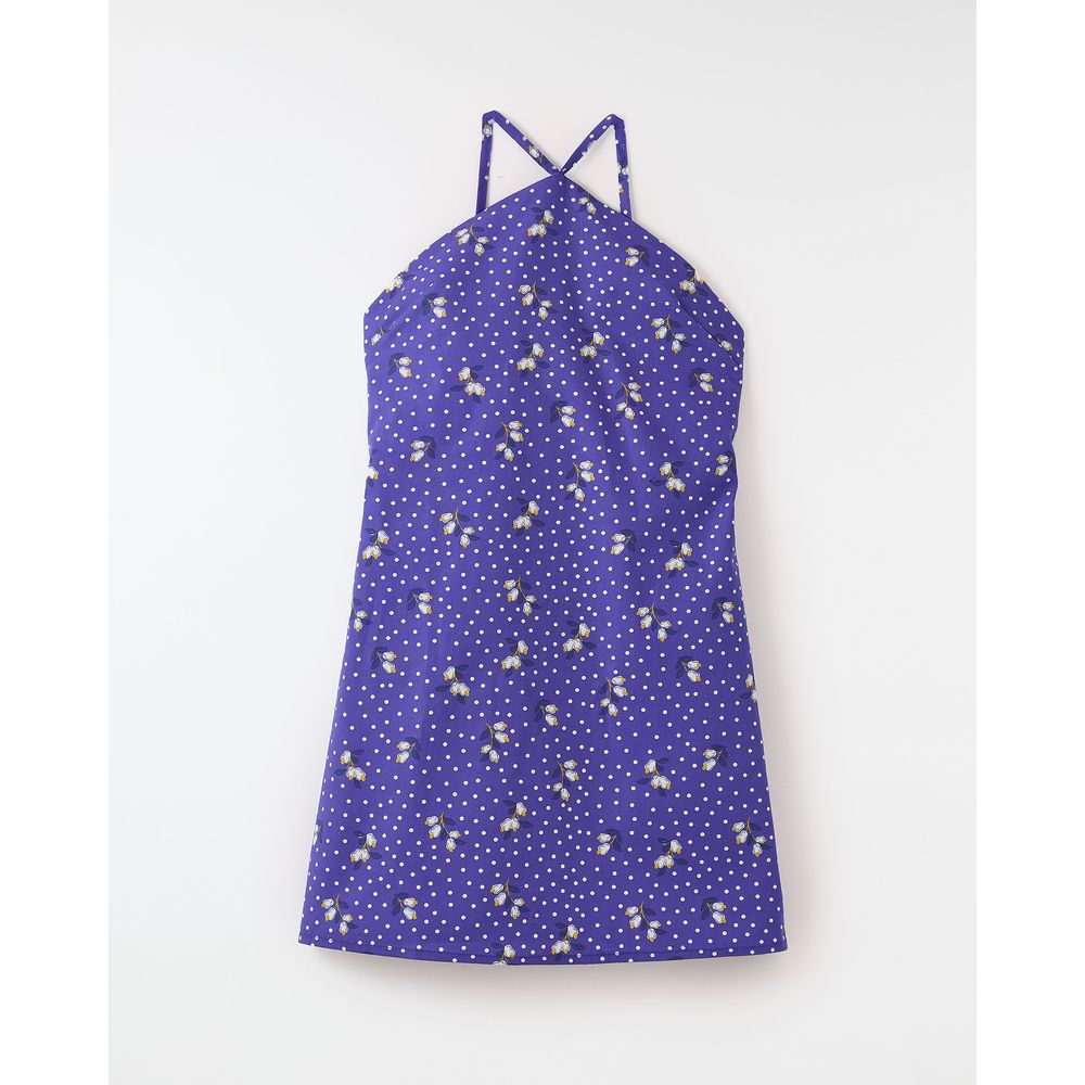 Vestido desenvolvido em tecido 100% algodão com decote alto, alças reguláveis por amarração traseira, fechamento por zíper nas costas e os desenhos da estampa Cajuzinho Poa.