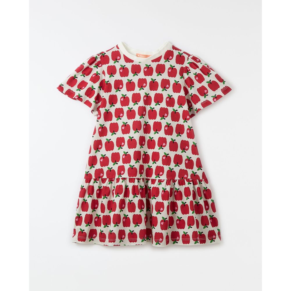 Vestido infantil desenvolvido em malha de algodão com mangas curtas soltinhas, vivo canelado em tom vibrante no decote redondo, barrado rodado e os desenhos de Maçãs da estampa.