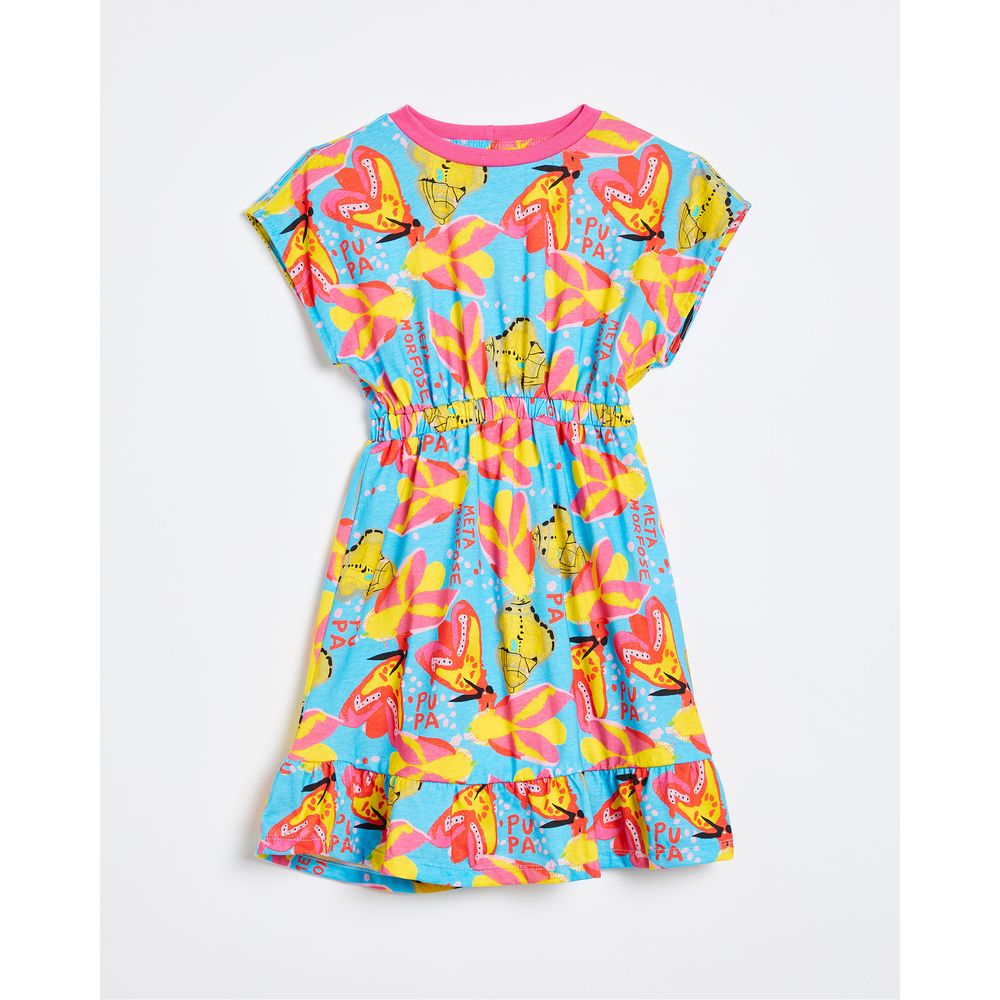 Vestido azul desenvolvido em malha de algodão para crianças, com mangas curtas sem cava, elástico na cintura, decote redondo com vivo canelado, saia rodada com babado na barra, e os desenhos coloridos da estampa Metamorfose.