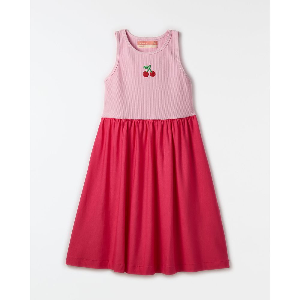 Vestido infantil com top de malha rib, alças, bordado frontal de cerejinhas, decote em u e saia rodada estampada desenvolvida em 100% algodão.