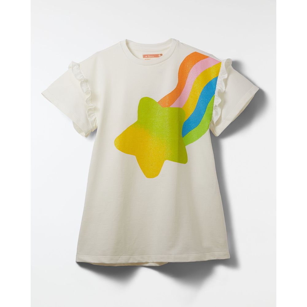 Vestido infantil desenvolvido em tecido 100% algodão com acabamento canelado no decote redondo, mangas curtas com babado e silk Brilho Iris na parte frontal.